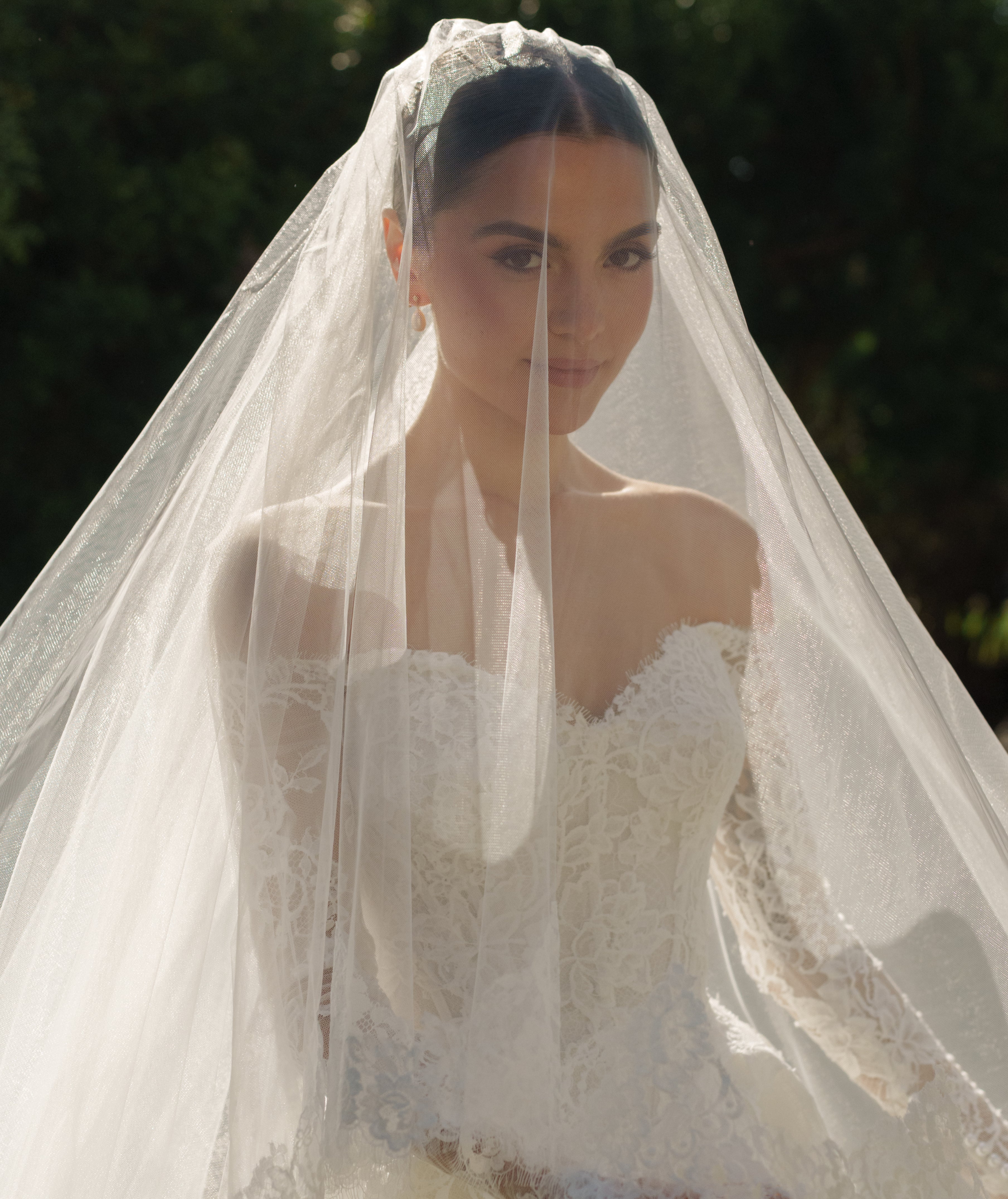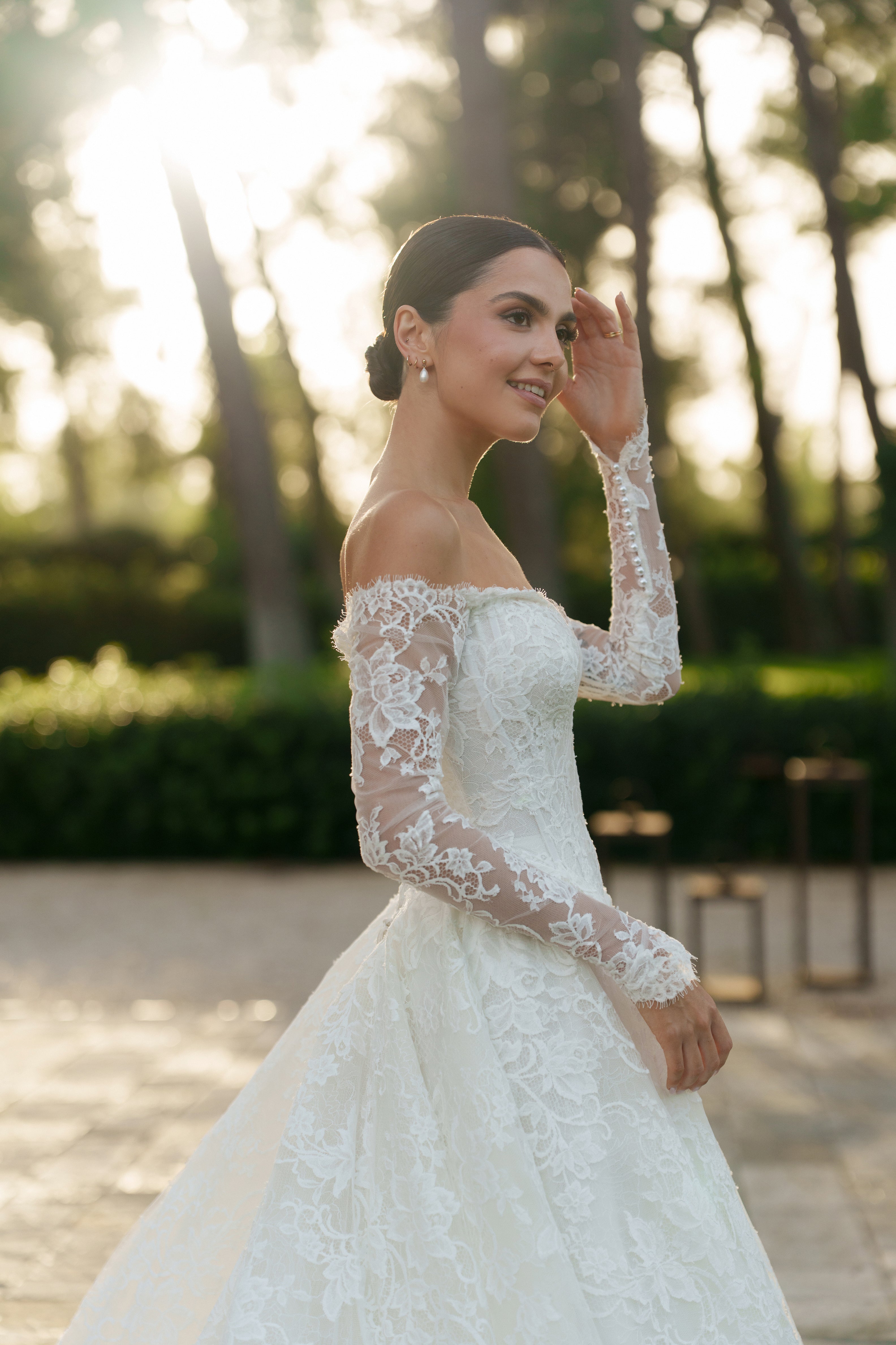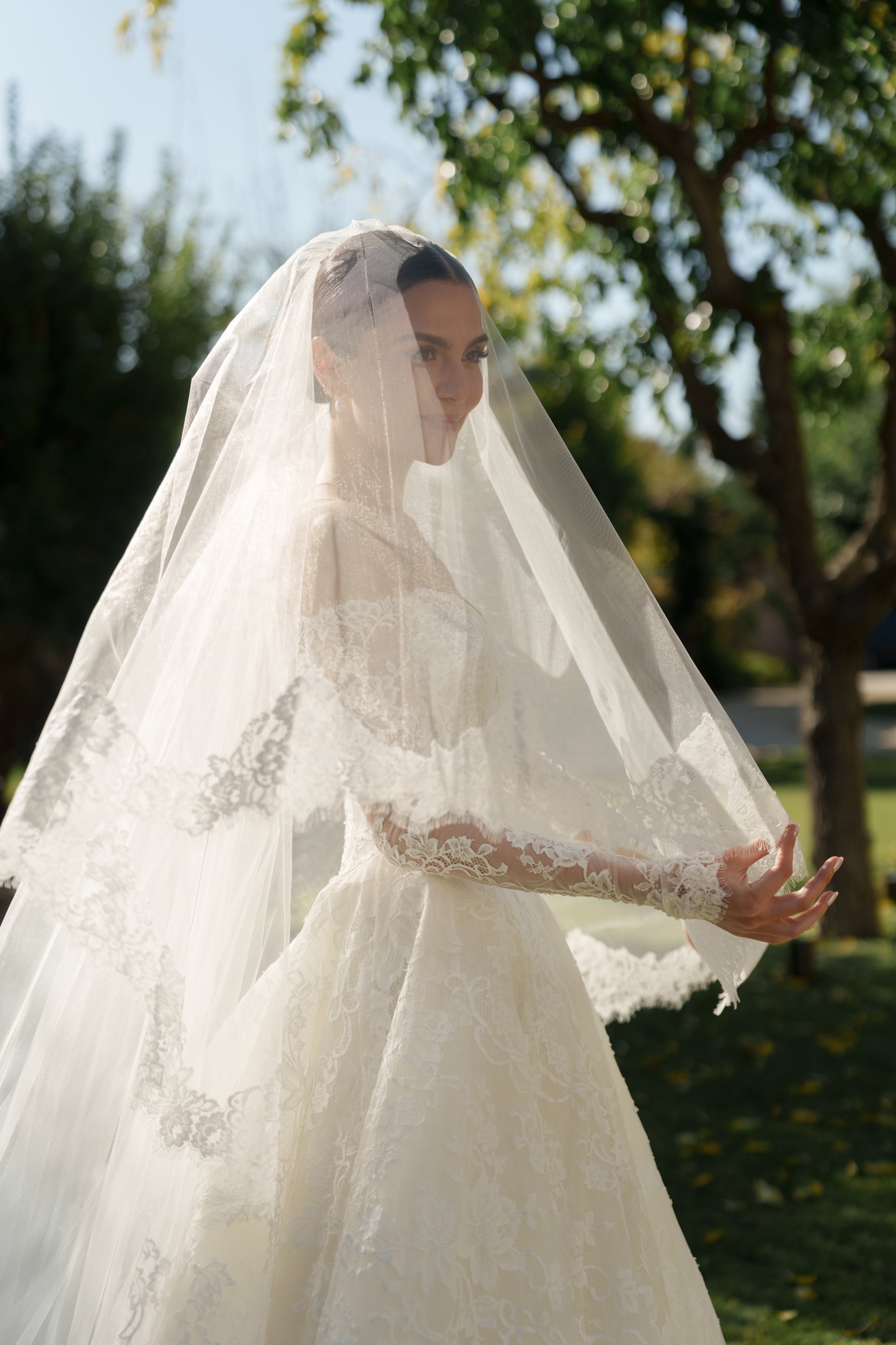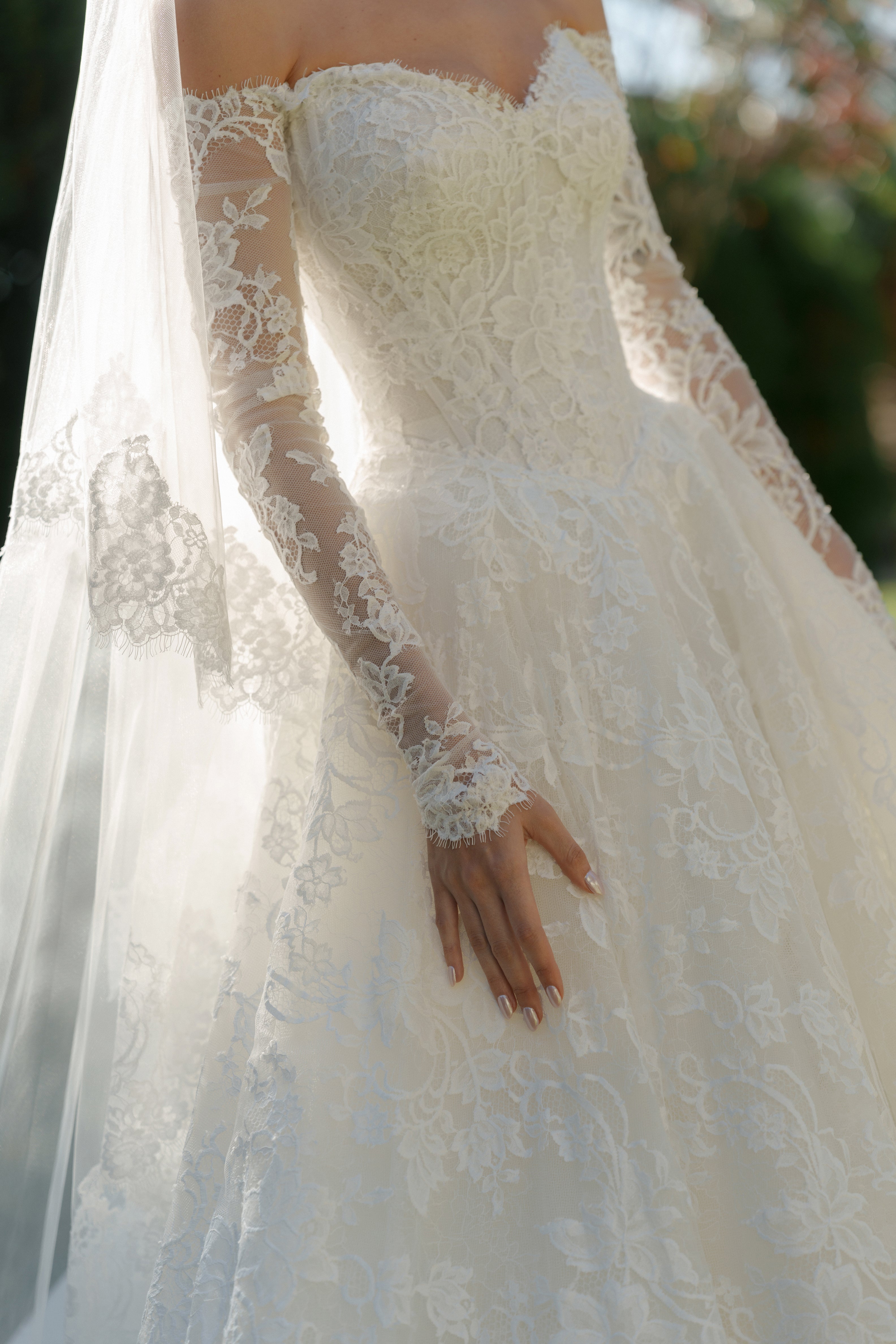 Madeleine chose our beautiful TORI gown in French lace, with a off-the-shoulder neckline with sleeves. The look was perfectly finished with our EVERLY VEIL.