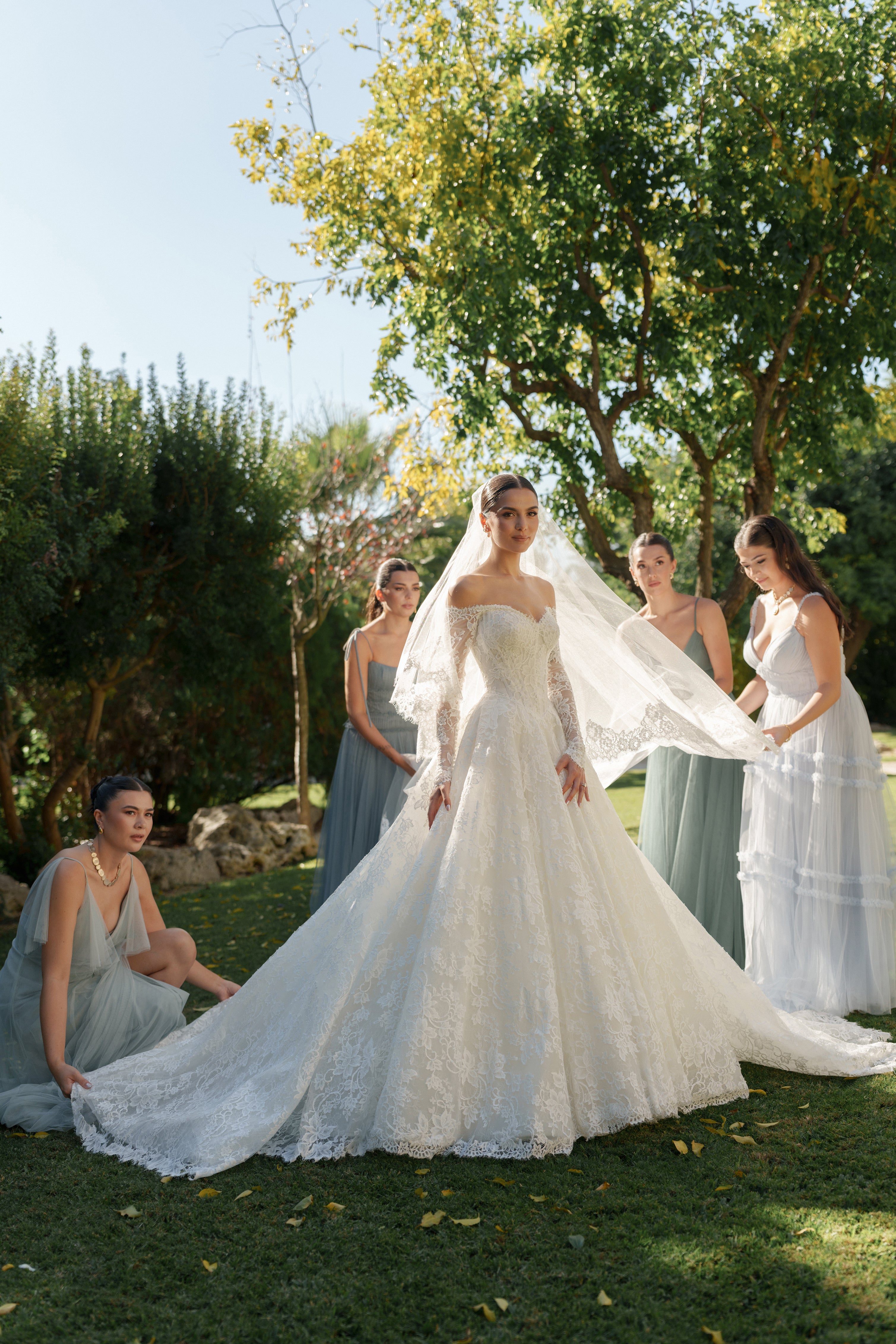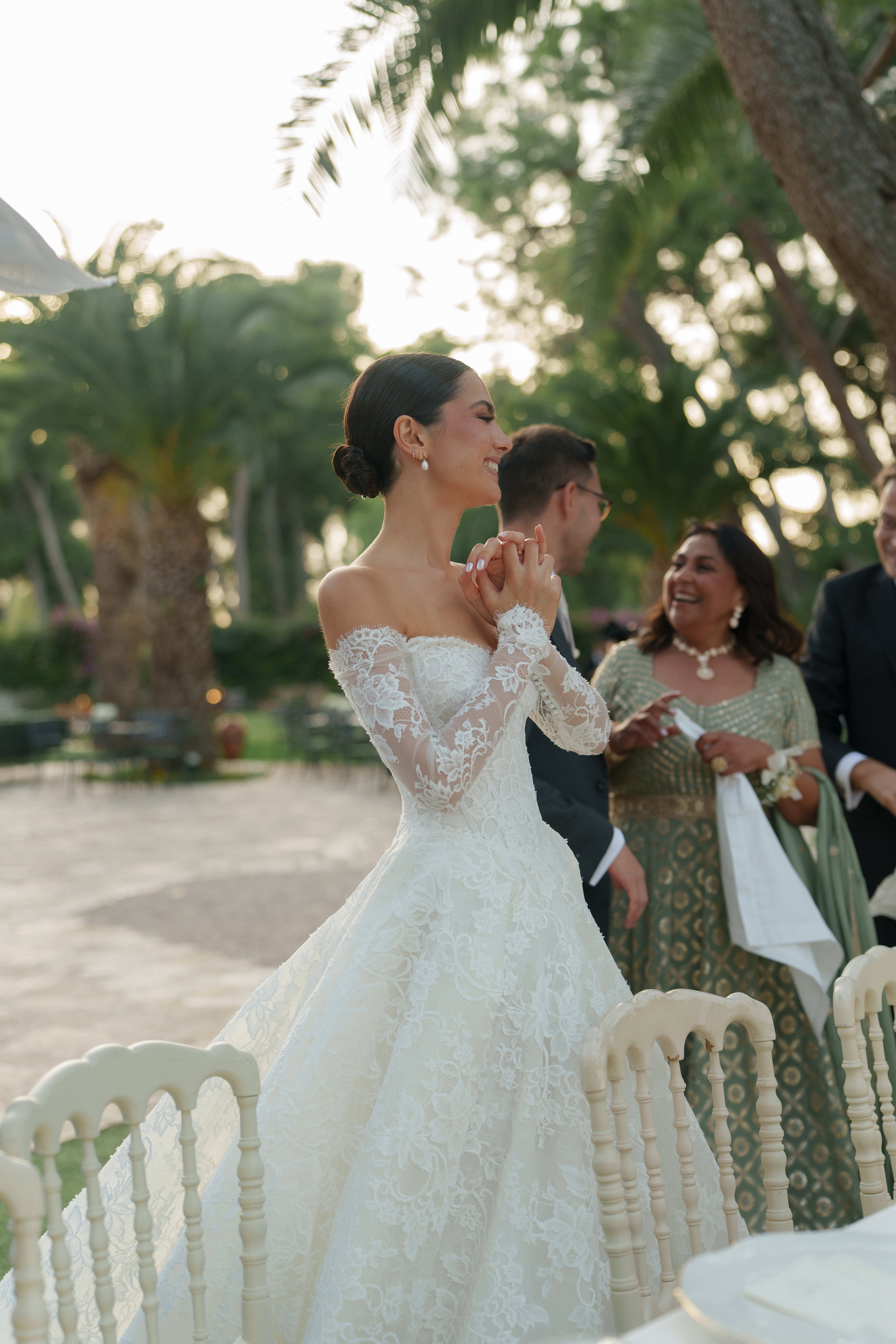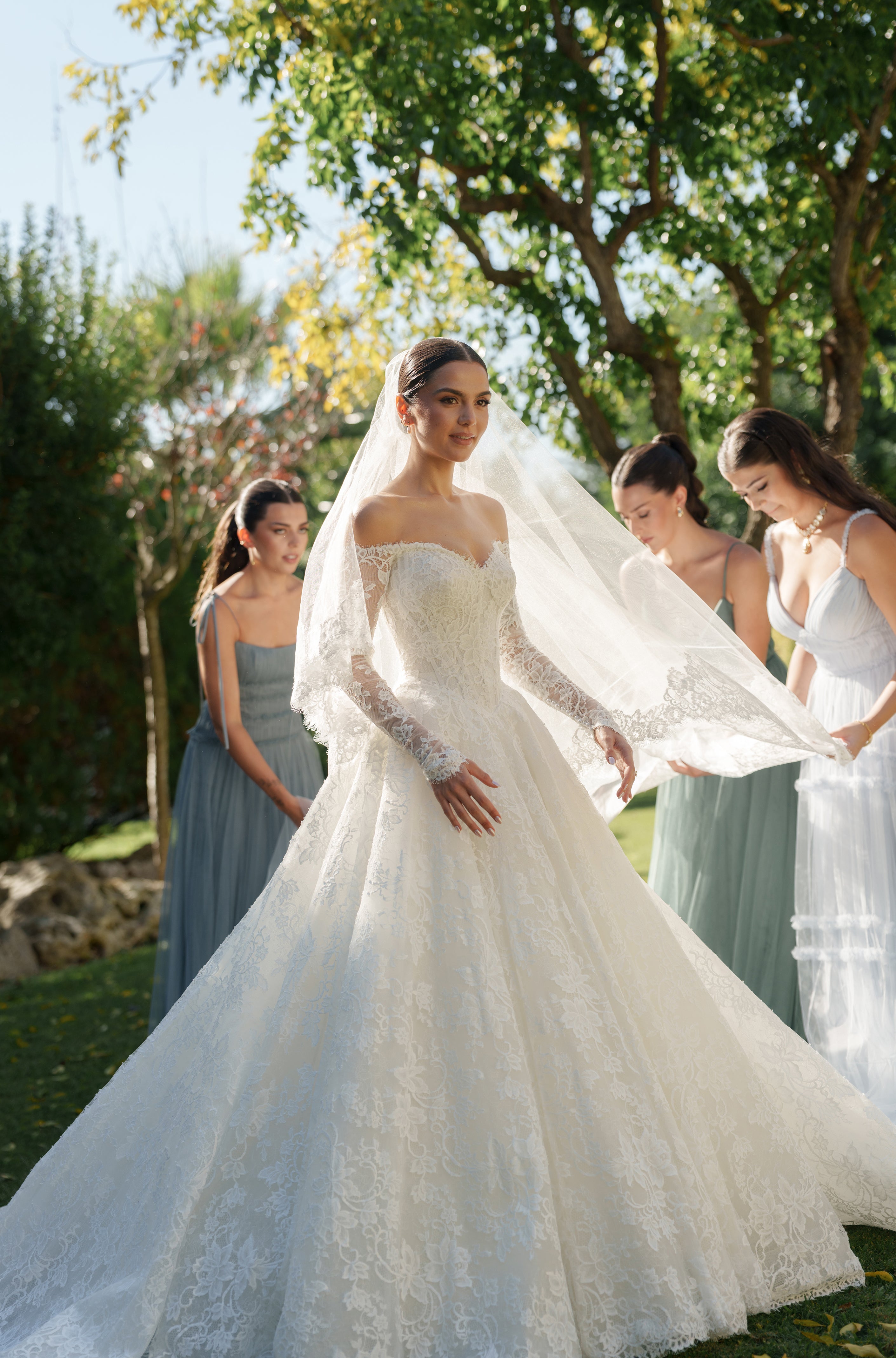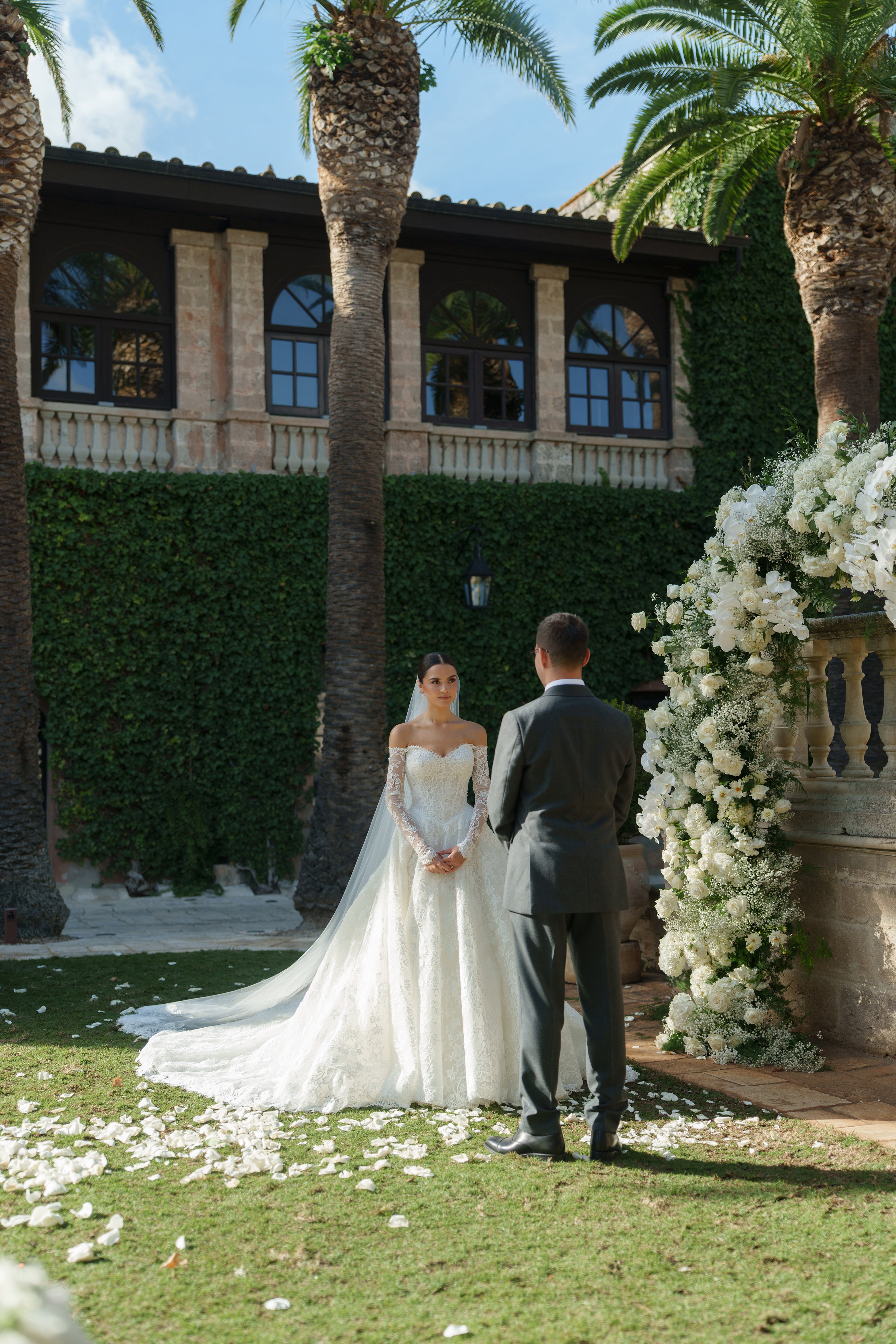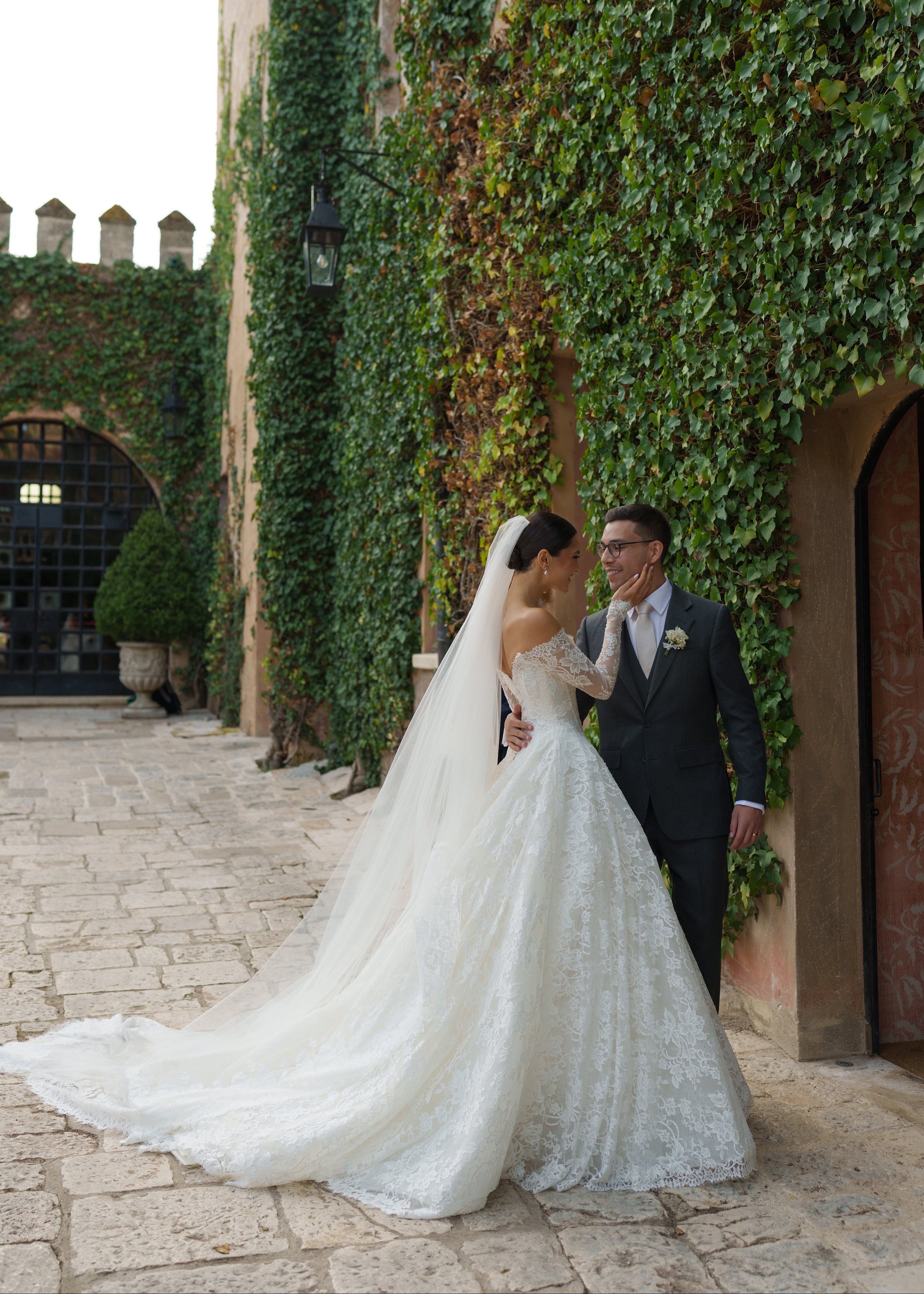 Madeleine chose our beautiful TORI gown in French lace, with a off-the-shoulder neckline with sleeves. The look was perfectly finished with our EVERLY VEIL.