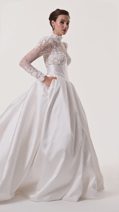 The Annalise Gown is the hero dress of the season, inspired by the timeless elegance of Grace Kelly. Featuring a regal high neckline and a dramatic full skirt, it is crafted in luxurious mikado with encrusted lace detailing that elevates its sophisticated silhouette. Designed for brides seeking a show-stopping, classic yet modern bridal look, Annalise exudes refined glamour from every angle.